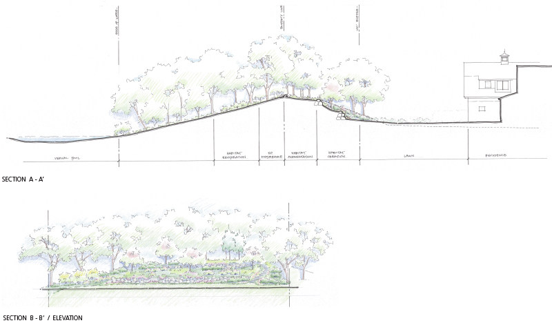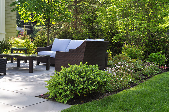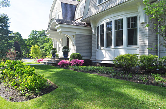 The strategy for the landscape of this new shingle style house was to provide a setting that would allow the house to blend into a traditional neighborhood of established homes. Mature pines at the street were retained and bolstered with plantings of dogwoods, rhododendrons and azaleas. At the front foundation, a restrained palette of low groundcovers and perennials is punctuated by a pair of large specimen boxwood at the front door. The bluestone terrace in the rear, accented by a flowering fringe tree, lilacs and perennials, occupies one of the principal views through the house and acts as an extension of the family room.