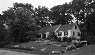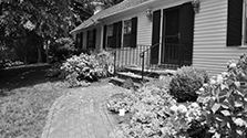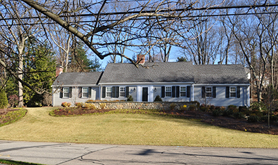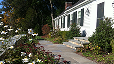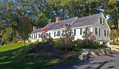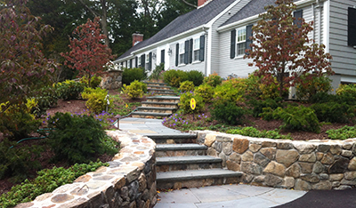A new fieldstone wall provides an architectural framework for the house as well as the entry garden. Although a large linden tree that dwarfed the house was removed, it was replaced with evergreen trees and dogwoods in the new planting beds and with sugar maples at the street.