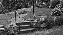 The conventional suburban landscape of this existing house was renovated with new stone retaining walls and a walkway to lead visitors from the driveway to the front entry garden. The extensive lawn area was reduced by adding generous plant beds filled with native and adapted native trees, shrubs and perennials.
