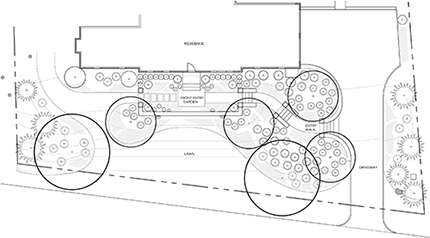 The entry garden addressed the client’s desire for a cottage style garden at the front door. In time, flowering shrubs and perennials will fill the space and spill over the walk.