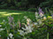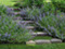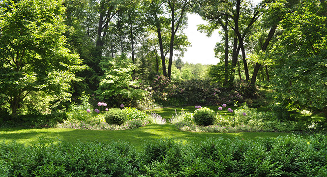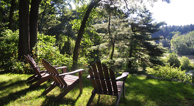 Unseen from the terrace, a cutting garden with flowering shrubs and perennials occupies the sunny slope at the lower lawn. A path leads through a woodland slope of native rhododendrons and azaleas to the top of a ridge. Adirondack chairs and a fire pit create a quiet sitting area overlooking wetlands.