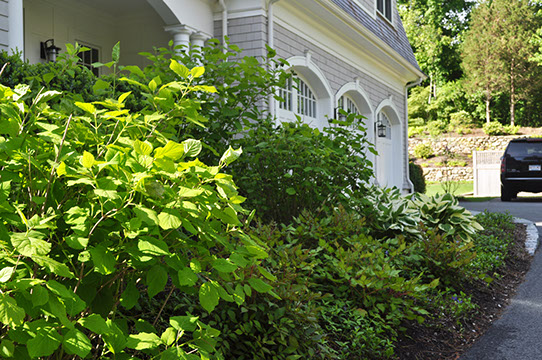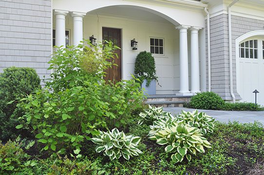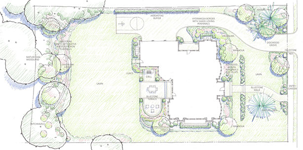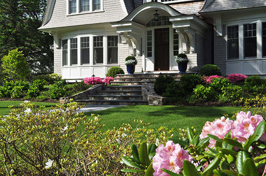 The strategy for the landscape of this new shingle style house was to provide a setting that would allow the house to blend into a traditional neighborhood of established homes. Mature pines at the street were retained and bolstered with plantings of dogwoods, rhododendrons and azaleas. At the front foundation, a restrained palette of low groundcovers and perennials is punctuated by a pair of large specimen boxwood at the front door. The bluestone terrace in the rear, accented by a flowering fringe tree, lilacs and perennials, occupies one of the principal views through the house and acts as an extension of the family room.