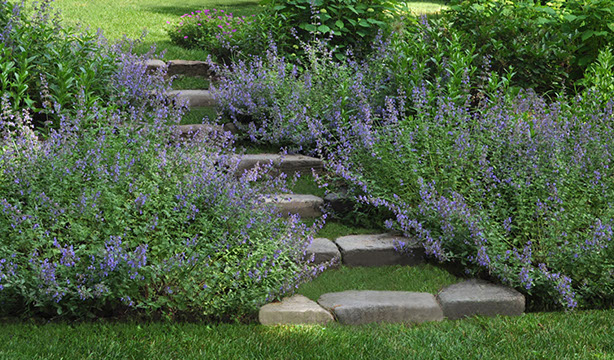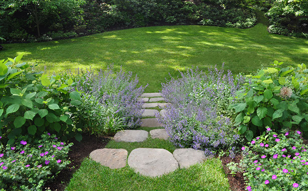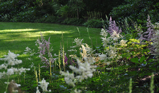 Unseen from the terrace, a cutting garden with flowering shrubs and perennials occupies the sunny slope at the lower lawn. A path leads through a woodland slope of native rhododendrons and azaleas to the top of a ridge. Adirondack chairs and a fire pit create a quiet sitting area overlooking wetlands.